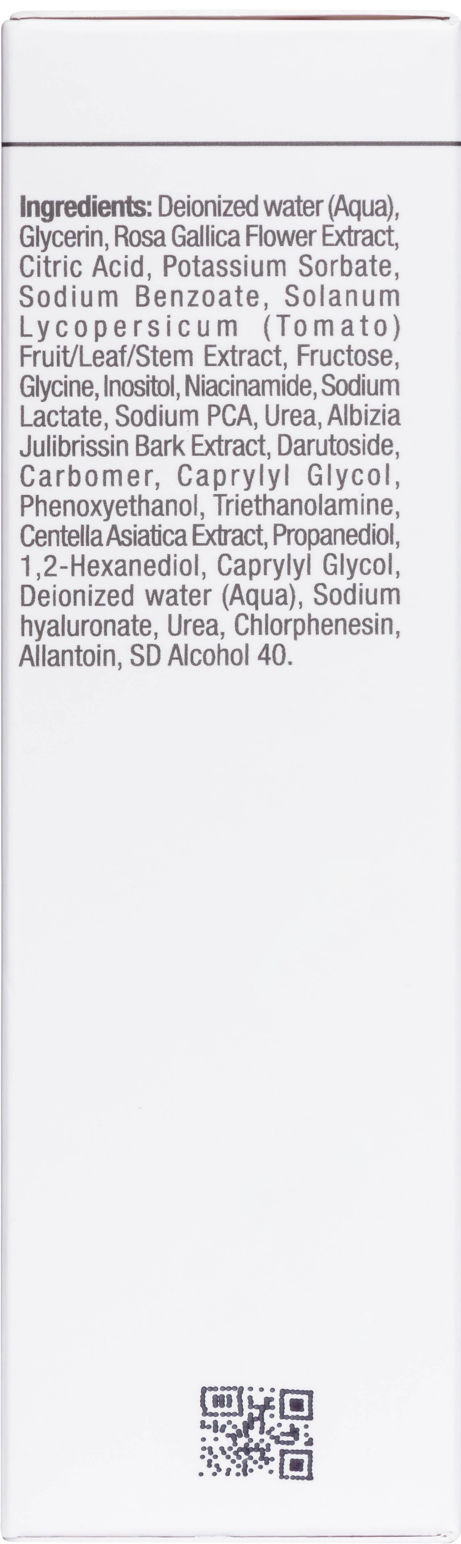 Deionized water (Aqua), Glycerin, Rosa Gallica Flower Extract, Citric Acid, Potassium Sorbate, Sodium Benzoate, Solanum Lycopersicum (Tomato) Fruit/Leaf/Stem Extract, Fructose, Glycine, Inositol, Niacinamide, Sodium Lactate, Sodium PCA, Urea, Albizia Julibrissin Bark Extract, Darutoside, Carbomer, Caprylyl Glycol, Phenoxyethanol, Triethanolamine, Centella Asiatica Extract, 1,2-Hexanediol, Caprylyl Glycol, Deionized water (Aqua), Sodium hyaluronate, Urea, Chlorphenesin, Allantoin, SD Alcohol 40.