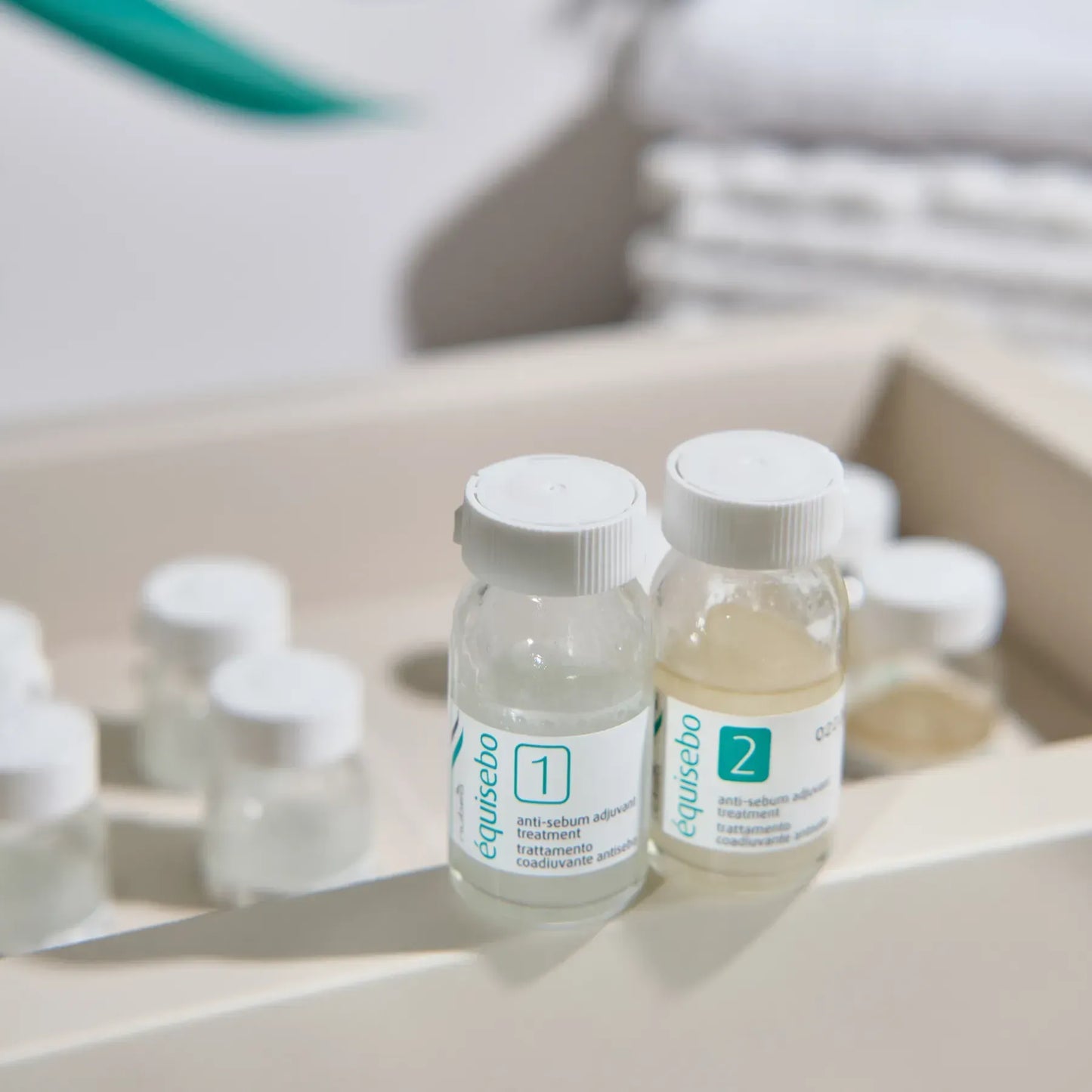 1. Перед використанням флаконів обовʼязково ретельно їх збовтайте. Вміст одного флакона 1 Équisebo рівномірно нанесіть на всю шкіру голови, рухайтесь по проділах.